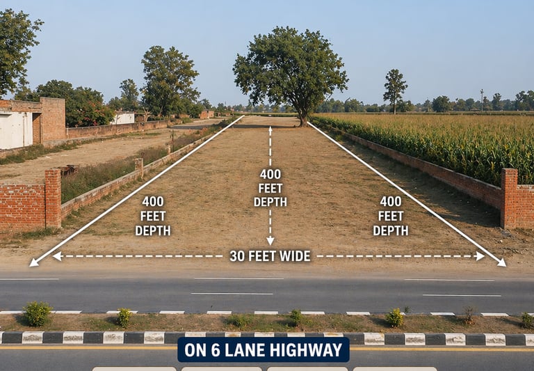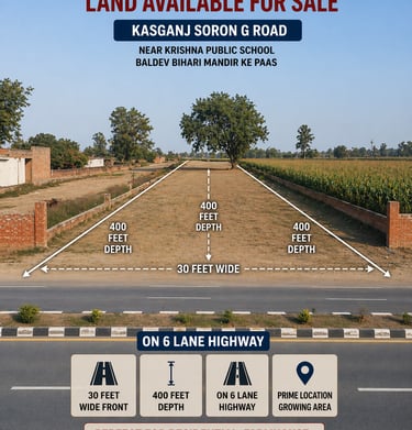 “A land parcel of approximately 1.75 bigha is available for sale on the Mathura–Bareilly 6-lane highway, located on the Kasganj–Soron Road. The property offers a 30-feet wide front with a depth of 450 feet, making it ideal for commercial or investment purposes.”